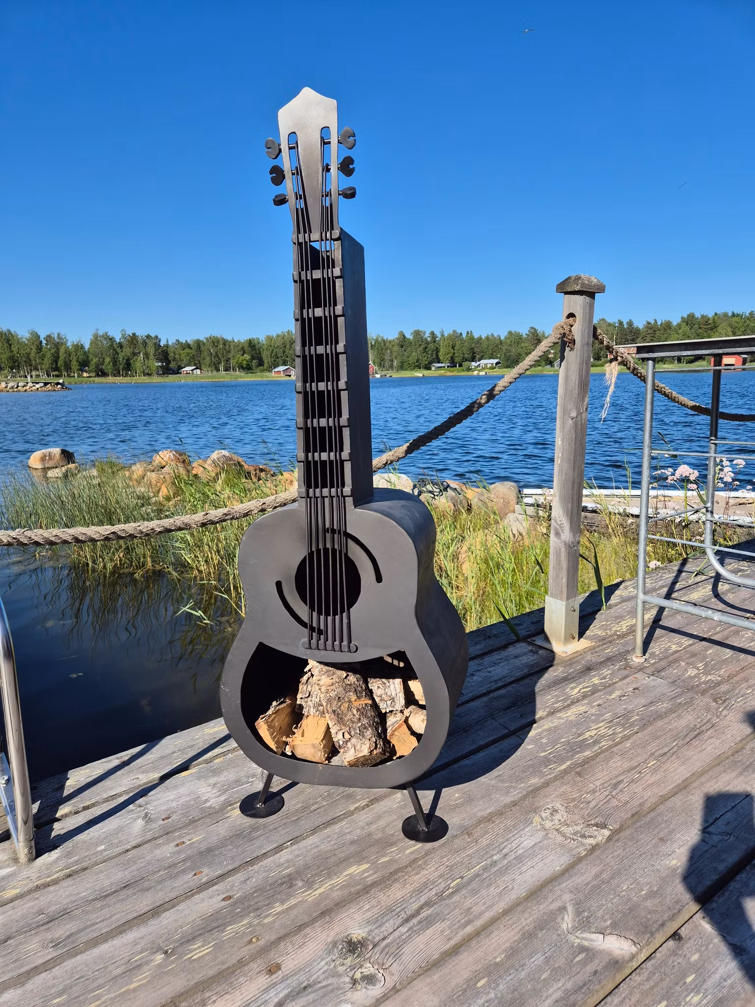 Unik eldstad i form av en gitarr. Gitarren är tillverkad av 2 mm cortenplåt.